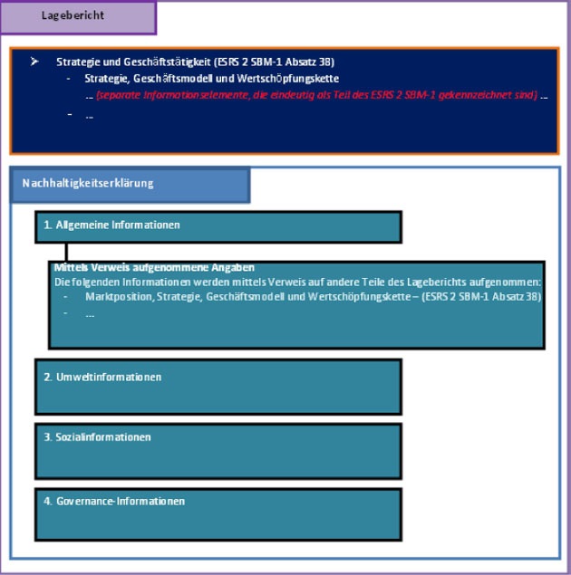 Diese Anlage ergänzt den ESRS 1. Sie enthält unverbindliche Veranschaulichungen zur Aufnahme von Informationen mittels Verweis auf einen anderen Abschnitt des Lageberichts in die Nachhaltigkeitserklärung gemäß Abschnitt 9.1 dieses Standards.