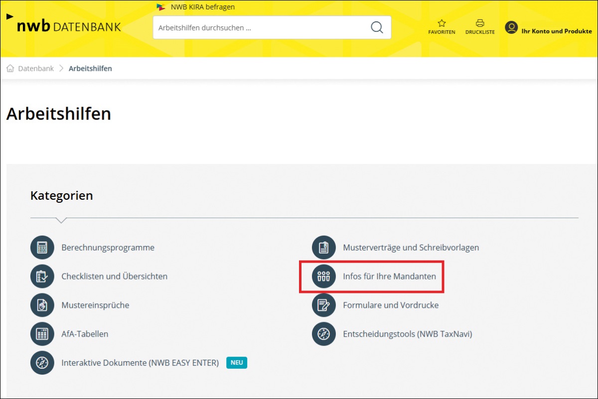 Sie können die Informationen von der Startseite der NWB Datenbank über einen Klick auf den Punkt „Arbeitshilfen“ aufrufen. Auf dieser Seite finden Sie eine gesonderte Kategorie mit dem Namen „Infos für Ihre Mandanten“. Dort sind nicht nur die gesammelten Mandanten-Informationen hinterlegt (sortiert nach Aktualität), sondern darüber hinaus auch interessante Merkblätter für Ihre Mandanten (z. B. zum Thema Photovoltaikanlage).