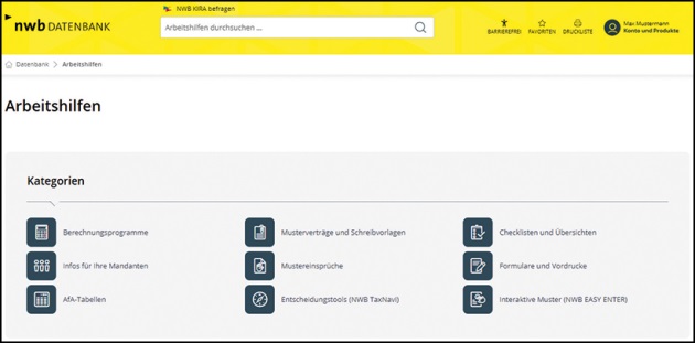 In der NWB Datenbank finden Sie nicht nur Aufsätze und Kurzkommentierungen, sondern darüber hinaus auch Grundlagen- und infoCenter-Beiträge und eine Vielzahl an verschiedenen Arbeitshilfen, wie z. B. Checklisten und Übersichten, Berechnungsprogramme oder Mandanten-Merkblätter.