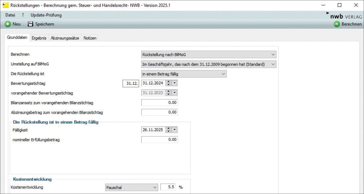 Hier können Sie für die Kostenentwicklung zwischen einem voreingestellten pauschalen Wert oder der Erfassung individueller, zeitraumbezogener Kostensteigerungen wählen. Für den handelsbilanziellen Abzinsungsbetrag greift das Programm direkt auf die maßgeblichen Zinssätze zurück, die auch in einem separaten Reiter dokumentiert sind. Die jeweils aktuellen Zinssätze können bei bestehender Online-Verbindung jederzeit im Programm aktualisiert werden. Eine Interpolation wird bei dem Berechnungsverfahren ebenfalls vorgenommen.