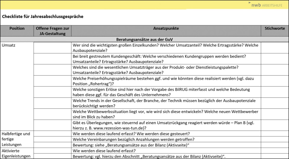 Die Checkliste „Jahresabschlussgespräch“ unterstützt Sie dabei, das Jahresabschlussgespräch strukturiert durchzuführen und Potenziale aufzudecken. Jede Position in GuV und Bilanz wird angesprochen und kann – je nach Mandantenbedarf – mehr oder weniger intensiv thematisiert werden (vgl. für einen Auszug aus der Checkliste Abbildung unten). Sie können die Checkliste z. B. ausdrucken, in das Jahresabschlussgespräch mitnehmen und individuell für Ihre Mandanten anpassen und daraus ggf. auch ein Ergebnisprotokoll erstellen.