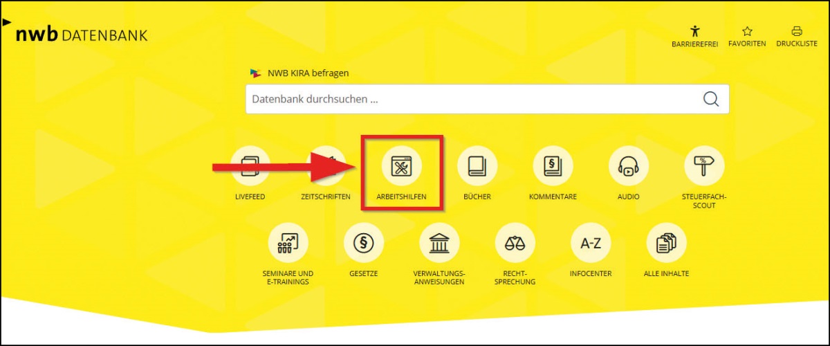Um [i]Checklisten, Berechnungsprogramme u. v. m. Ihre tägliche Arbeit zu erleichtern, stehen Ihnen in der NWB Datenbank zahlreiche Arbeitshilfen zur Verfügung. Sie sind auf der Startseite der NWB Datenbank unterhalb des Suchfelds aufrufbar.