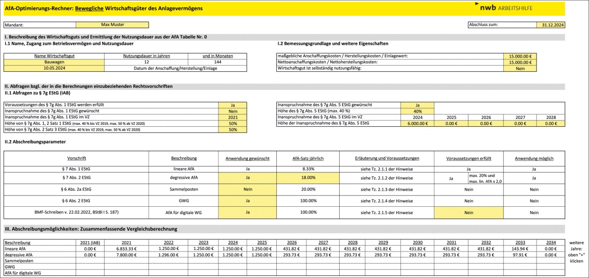 Dieses mandantenfähige Tool, abrufbar unter NWB XAAAJ-16885, bietet eine praxisnahe Unterstützung und kann die im Einzelfall maßgeblichen Abschreibungsmöglichkeiten veranschaulichen. Hiermit können Sie für bewegliche und unbewegliche Wirtschaftsgüter die verschiedenen Abschreibungsmethoden und Kombinationen gegenüberstellen und erhalten eine übersichtliche Auswertung, welche Abschreibungsmöglichkeiten zu einem für Sie optimalen Ergebnis führen. Dies dient Ihnen als Entscheidungsgrundlage und gibt die Möglichkeit, verschiedene Varianten zu berechnen.