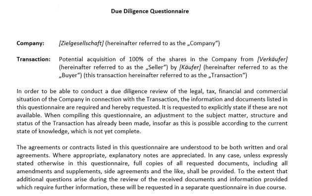 Es handelt sich bei dem englischsprachigen Muster um ein Due Diligence-Anforderungsschreiben für einen Unternehmenskauf im Wege eines Share Deal, bei dem 100 % der Anteile an der Zielgesellschaft von einem Käufer mit Sitz in der Bundesrepublik Deutschland erworben werden sollen. Das Muster eignet sich grundsätzlich aber auch für den Erwerb von weniger als 100 % der Anteile an einer Gesellschaft. Es kann allerdings nicht unverändert bei jedem Unternehmenskauf verwendet werden, sondern muss den jeweiligen Gegebenheiten bei der Zielgesellschaft angepasst werden.