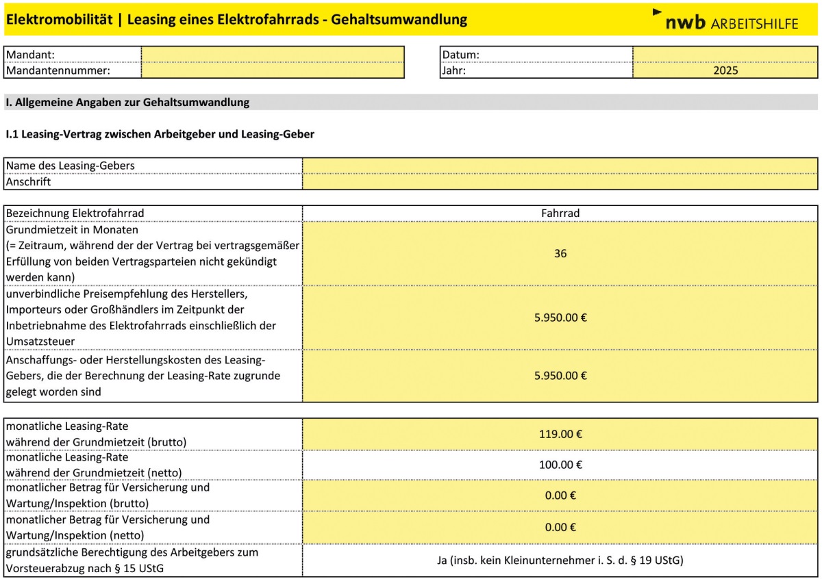 Das Tool bietet Ihnen verschiedene Variantenrechnungen und eine Grundlage für die optimale Dokumentation. Durch die integrierte Mandantenmaske lassen sich die Daten leicht zuordnen und griffbereit abspeichern. Weitere Arbeitshilfen zum Thema: Leasing Elektrofahrräder: Überlassung an Arbeitnehmer – Muster, Arbeitshilfe, abrufbar unter NWB DAAAH-47277.