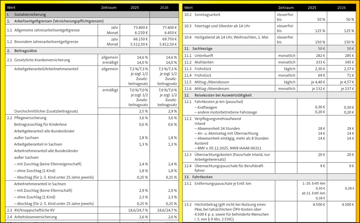 Zum Jahresbeginn ändern sich im Steuer- und Sozialversicherungsrecht regelmäßig zahlreiche Werte: Freibeträge, Beitragssätze, Sachbezugswerte, Pauschalen, Fälligkeitstermine u. v. m. Für die tägliche Arbeit in Kanzleien stellt sich daher die Frage: „Wo finde ich alle relevanten Werte, schnell, aktuell und ohne lange suchen zu müssen?“ Gerade im hektischen Kanzleialltag ist es entscheidend, alle wichtigen Werte an einer zentralen, verlässlichen Stelle abrufen zu können – ohne zeitraubende Recherche in Gesetzestexten, Richtlinien, Verordnungen oder Rundschreiben.