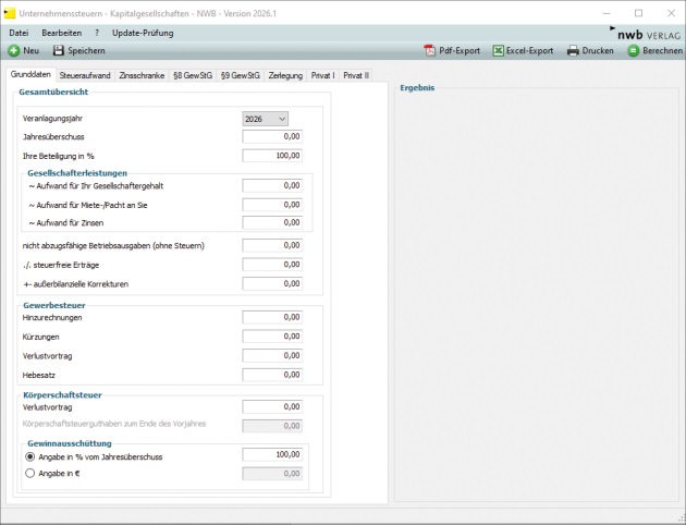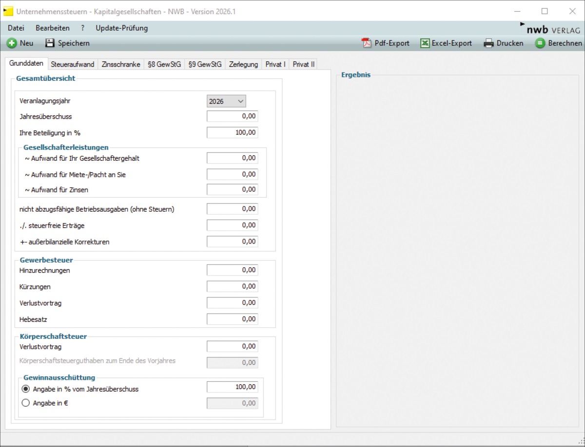 Dieses umfassende Berechnungsprogramm, abrufbar unter NWB RAAAC-47257, unterstützt Sie dabei, die Steuerbelastung auf der Gesellschafts- und Gesellschafterebene möglichst präzise zu ermitteln. In acht Schritten werden alle relevanten Daten erfasst: Neben dem Jahresüberschuss und den nicht abzugsfähigen Betriebsausgaben sind dies insbesondere die Leistungen an die Gesellschaft, die Gewinnausschüttung, die gewerbesteuerlichen Daten und körperschaftsteuerlichen Verlustvorträge. Auch die steuerlichen Vorauszahlungen und Vorjahreszahlungen sowie die im Hinblick auf die Zinsschranke relevanten Werte werden abgefragt und bei der Berechnung berücksichtigt.