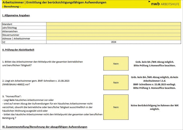 Diese Arbeitshilfe, abrufbar unter NWB QAAAE-32657, bietet Ihnen ein Prüfschema und zugleich eine Dokumentation, ob in welchem Umfang Aufwendungen für ein Arbeitszimmer jeweils berücksichtigt werden können.
